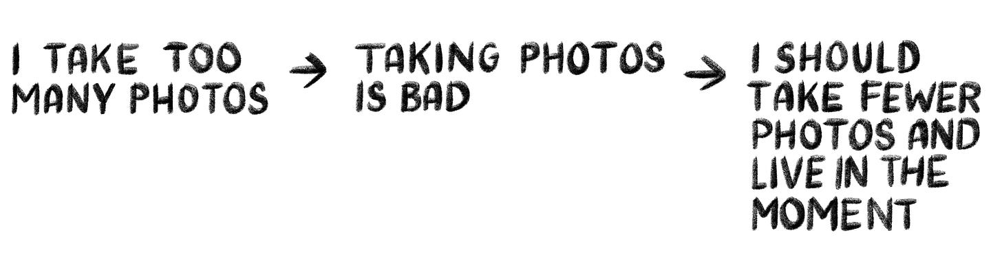 Of course, it would be silly to think that there are never moments worth capturing. The key element lies in determining which moments are worth capturing and how we capture them. Intentionality - i.e., documenting should not be automatic but done consciously. In their research, Barasch and Co. use the term self-relevance, “we argue that people in fact take photos in order to engage with and remember those experiences that are self-relevant.”6