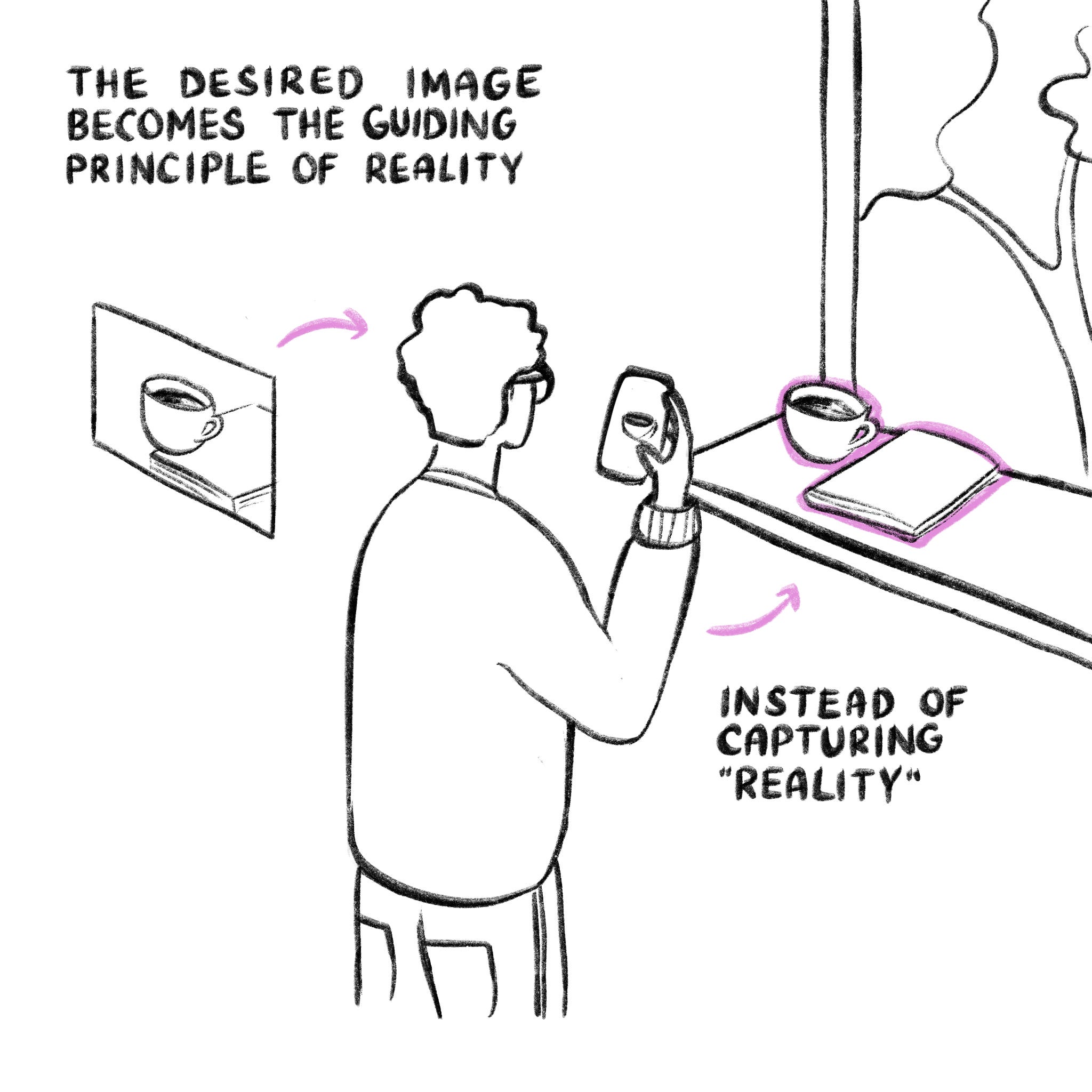 Again: am I taking a picture of this cappuccino because I engage with it or because I am recreating an aesthetic that I’ve consumed online? Maybe I slide my hardcover book into the photo next to my coffee, just to let everyone know that I’m an avid reader. I’m framing the image I want to broadcast in order to form a perception of myself to others. Let’s take things a step further: did I choose to come to this café because it appealed to me or because it conforms with my expectations of how a café should look according to what I consume? Because I know I want to take a picture of my coffee, I choose a place that will be most ‘documentable.’ As French philosopher Jean Baudrillard put it: